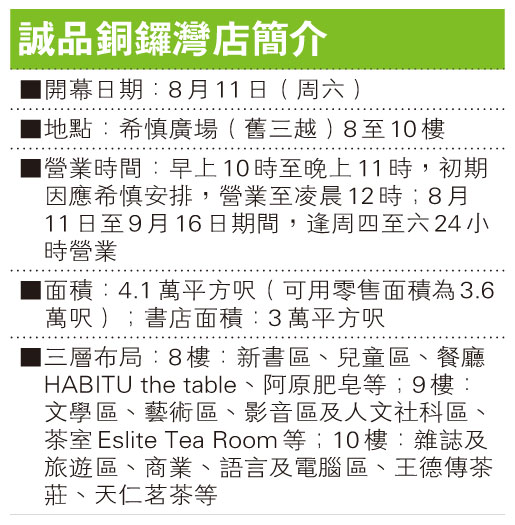 位處銅鑼灣希慎廣場八至十樓的誠品書店,據悉下周四晚邀請本港文化界人士參與貴賓之夜,周五試業一天,隨即在下周六正式開幕…